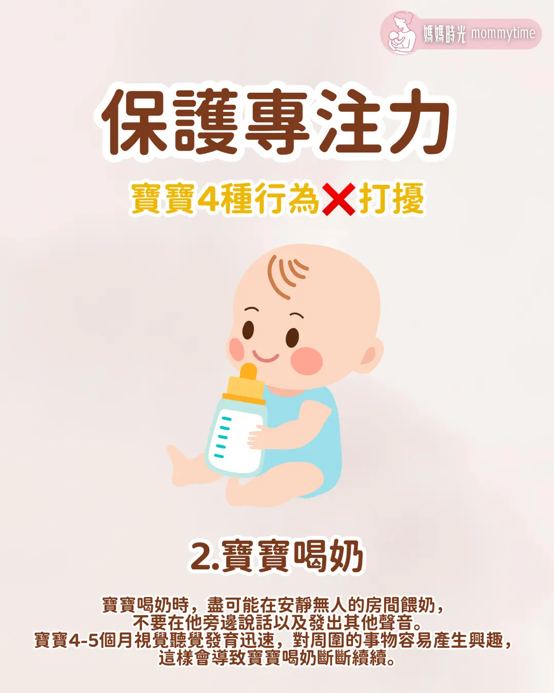 寶寶喝奶時,盡可能在安靜無人的房間餵奶,不要在他旁邊說話以及發出其他聲音。寶寶4-5個月視覺聽覺發育迅速,對周圍的事物容易產生興趣,這樣會導致寶寶喝奶斷斷續續🥲。