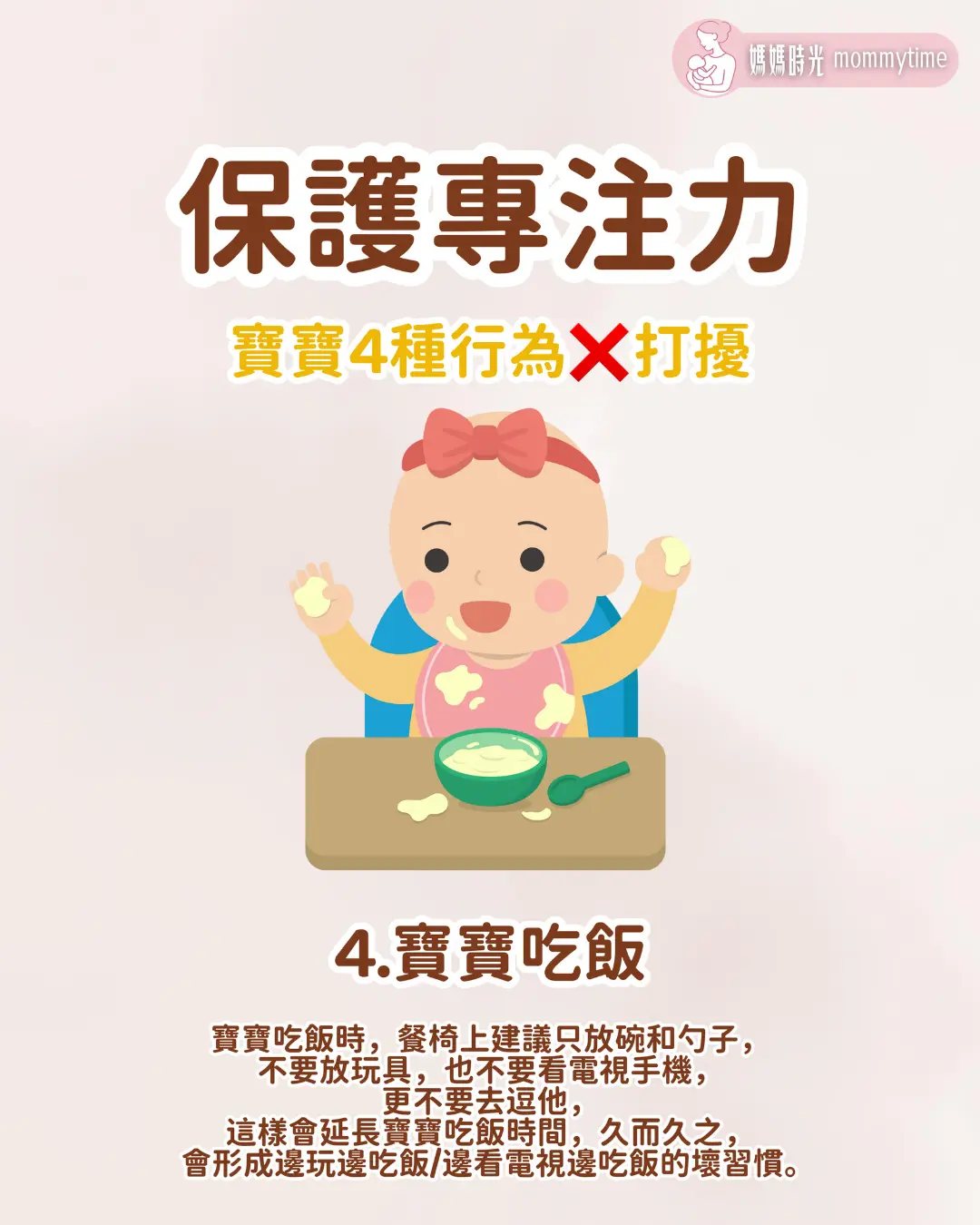 寶寶吃飯時,餐椅上建議只放碗和勺子,不要放玩具,也不要看電視📺/手機📱,更不要去逗他,這樣會延長寶寶吃飯時間,久而久之,會形成邊玩邊吃飯/邊看電視邊吃飯的壞習慣。