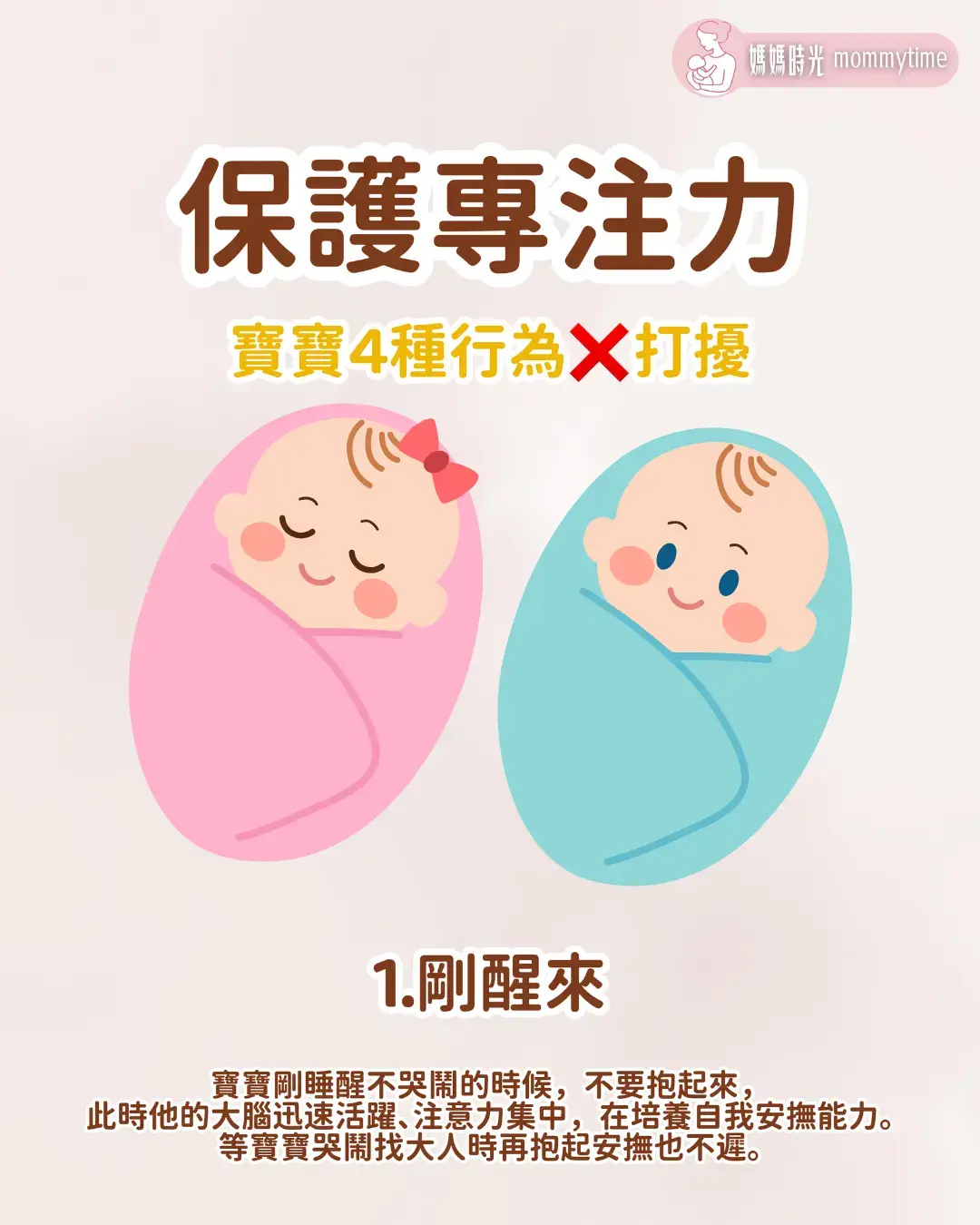 寶寶剛睡醒不哭鬧的時候,不要抱起來,此時他的大腦迅速活躍、注意力集中,在培養自我安撫能力。等寶寶哭鬧找大人時再抱起安撫也不遲❤️。