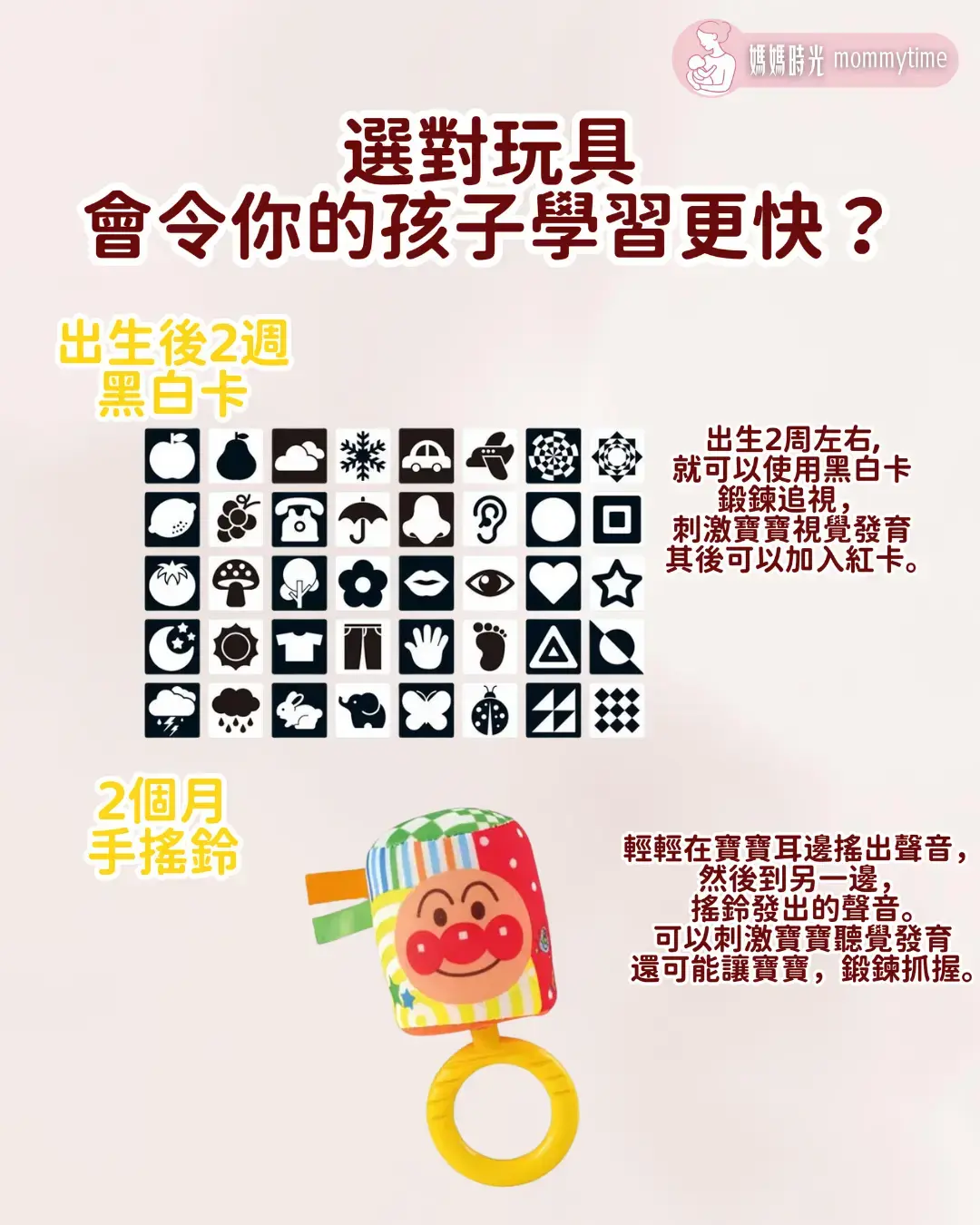 出生2周左右,就可以使用黑白卡,鍛鍊追視,刺激寶寶視覺發育,其後可以加入紅卡。