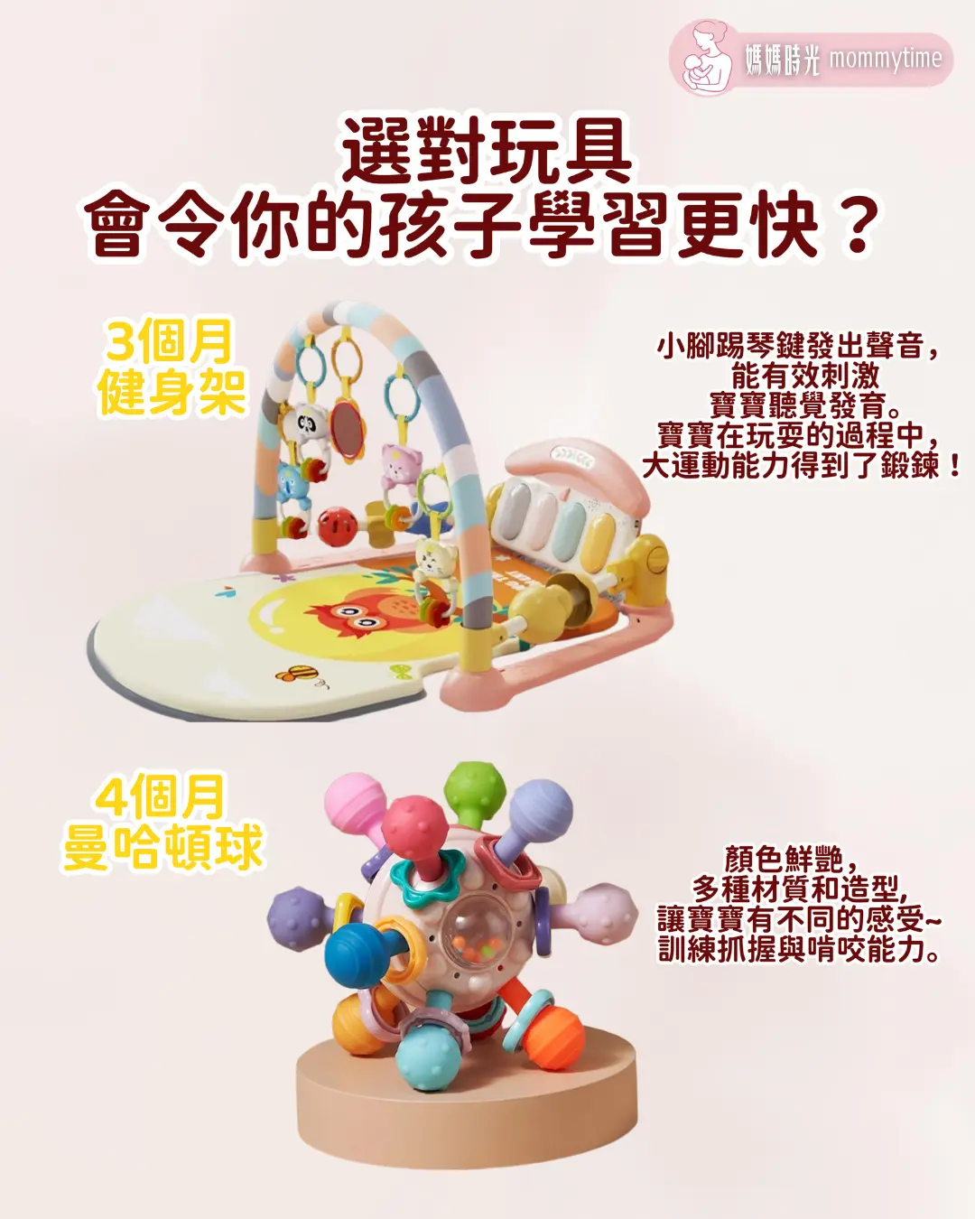 顏色鮮艷的曼克頓球適合4個月的寶寶,因為視覺發展開始提升可以看到多種顏色。不同的材質和造型,讓寶寶有不同的感受~訓練抓握與啃咬能力!