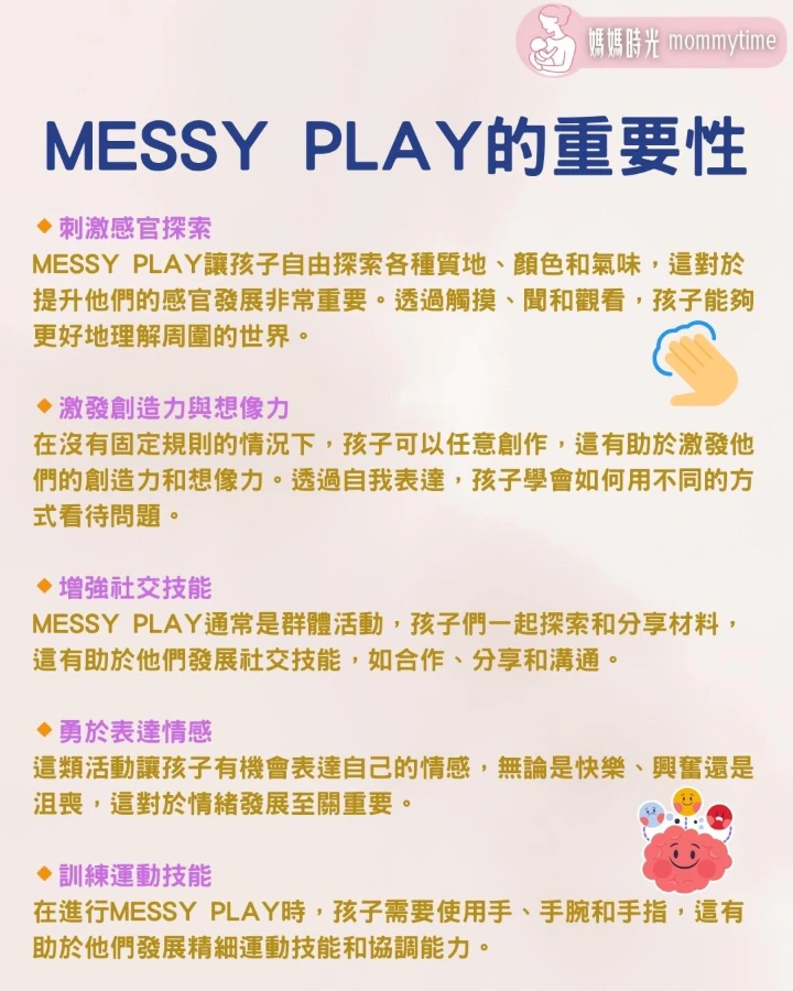 MESSY PLAY其實是一種兒童發展科學的學習方式,幾乎沒有遊戲規則,而且鼓勵小朋友自創新奇玩法,同時能夠充分滿足嬰幼兒的感官需求❗️