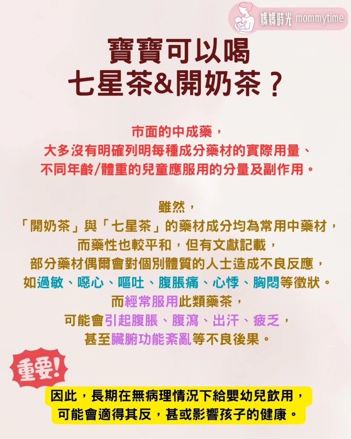 雖然,「開奶茶」與「七星茶」的藥材成分均為常用中藥材,而藥性也較平和,但有文獻記載📖,部分藥材偶爾會對個別體質的人士造成不良反應,如過敏、噁心、嘔吐、腹脹痛、心悸、胸悶等徵狀。而經常服用此類藥茶,可能會引起腹脹、腹瀉、出汗、疲乏,甚至臟腑功能紊亂等不良後果。