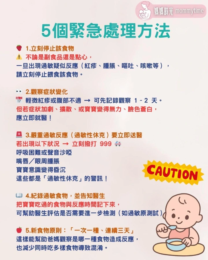 🍓 1️⃣ 立刻停止該食物�⚠️ 不論是副食品還是點心,一旦出現過敏疑似反應(紅疹、腫脹、嘔吐、咳嗽等),請立刻停止餵食該食物。