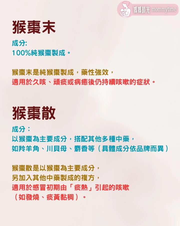 🔸成分與特點: 由猴棗末及其他多種中藥(如黨參、茯苓、川貝母、朱砂等)製成的複方製劑。 �🔸主要功用: 化痰止咳、清熱解毒,同時也能鎮驚、止瀉等,用途廣泛。 �🔸使用時機: 適用於由感冒引起的痰熱咳嗽,通常是感冒初、中期,伴有發燒、痰黃黏稠等症狀時。 ��📌兩者都不應視為日常保健品,使用前應諮詢專業醫生意見,特別是六歲以下的嬰幼兒。